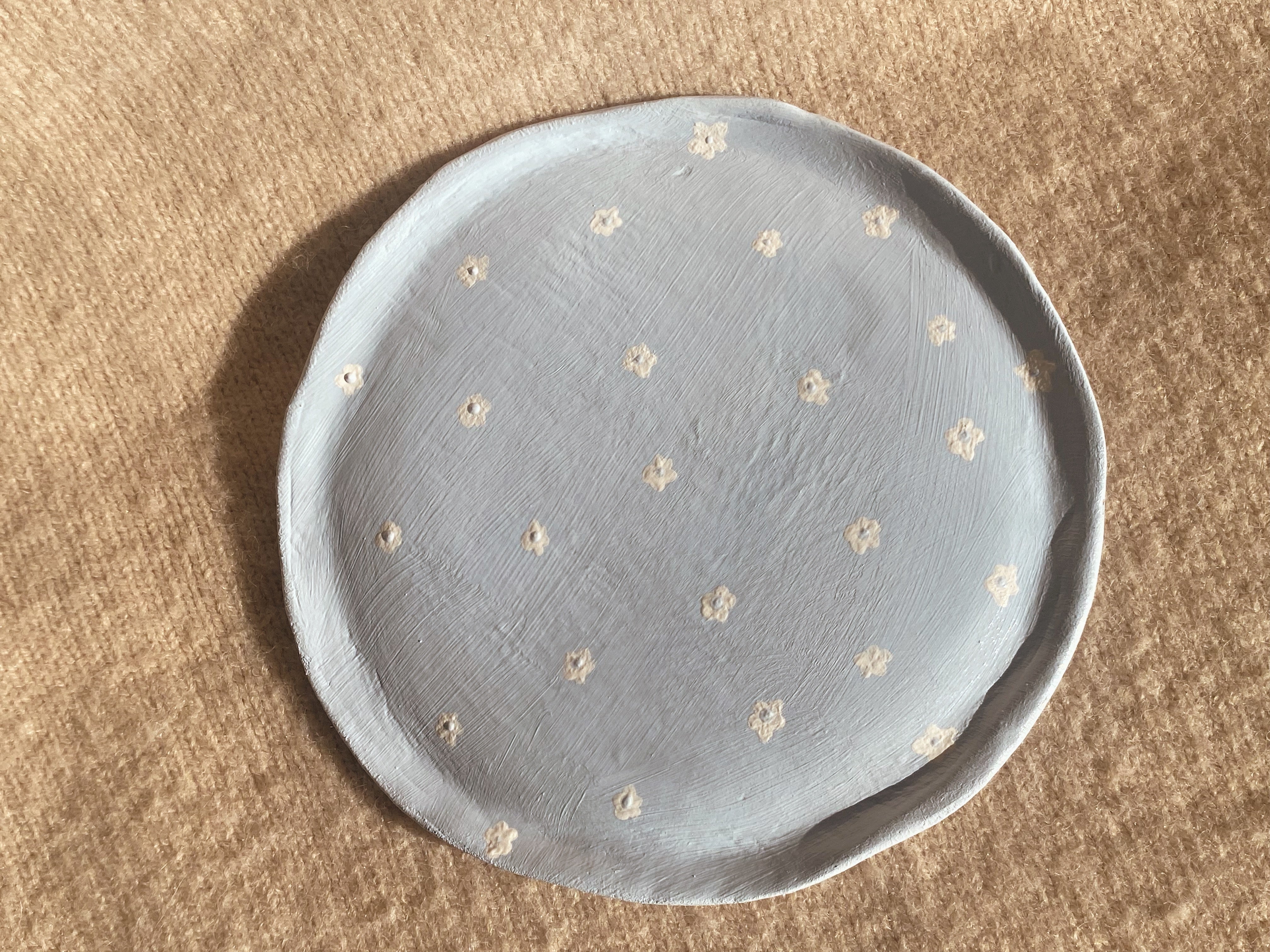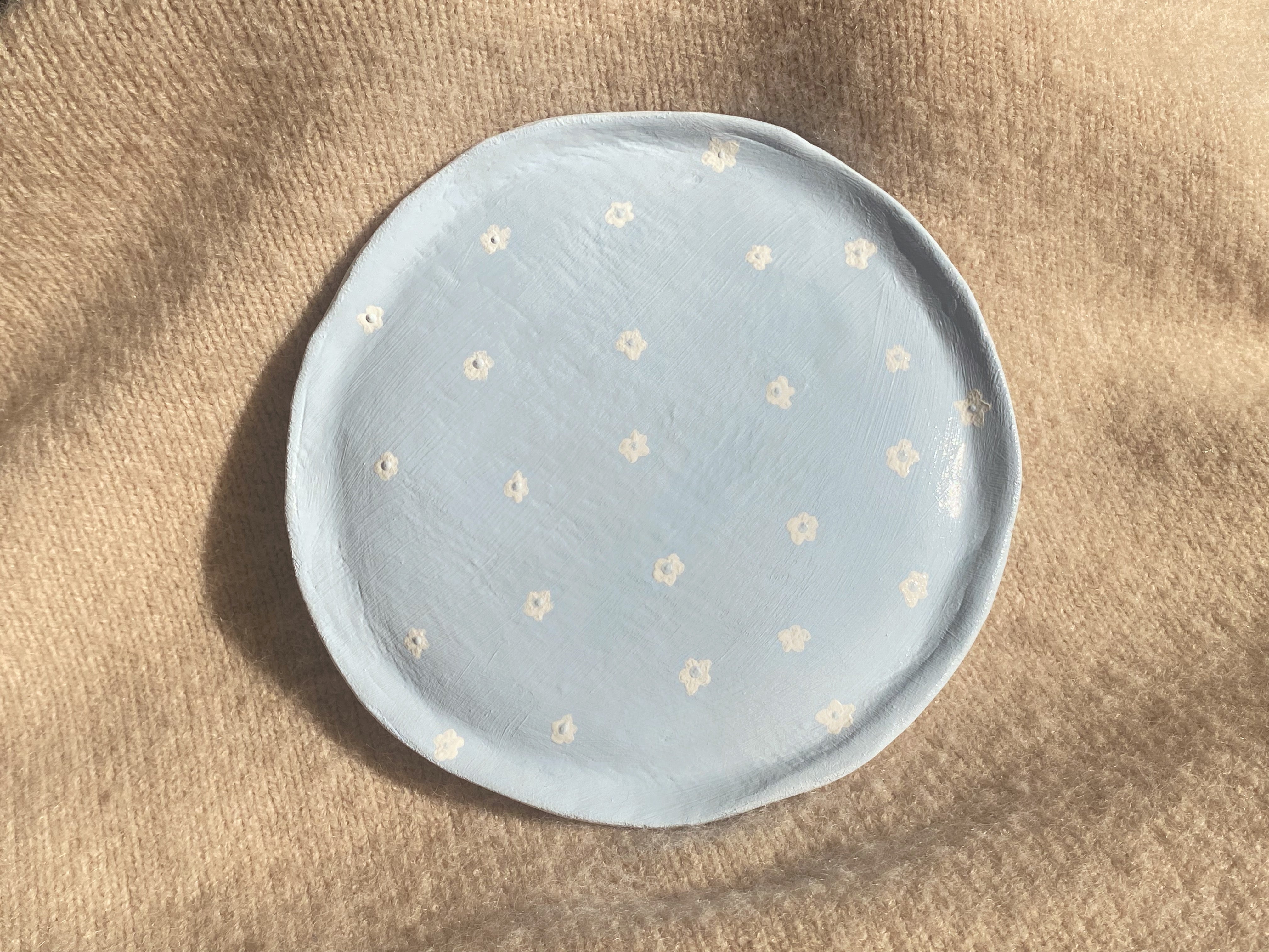 This clay dish is hand painted with little white flowers on a baby blue background. Use your trinket tray as a decor candle burning dish, or a catch-all for jewelry, hair clips, keys, and other accessories. These dishes are handmade with clay, painted with acrylic paints, and then sealed with a clear coat to create a durable and shiny finish.
