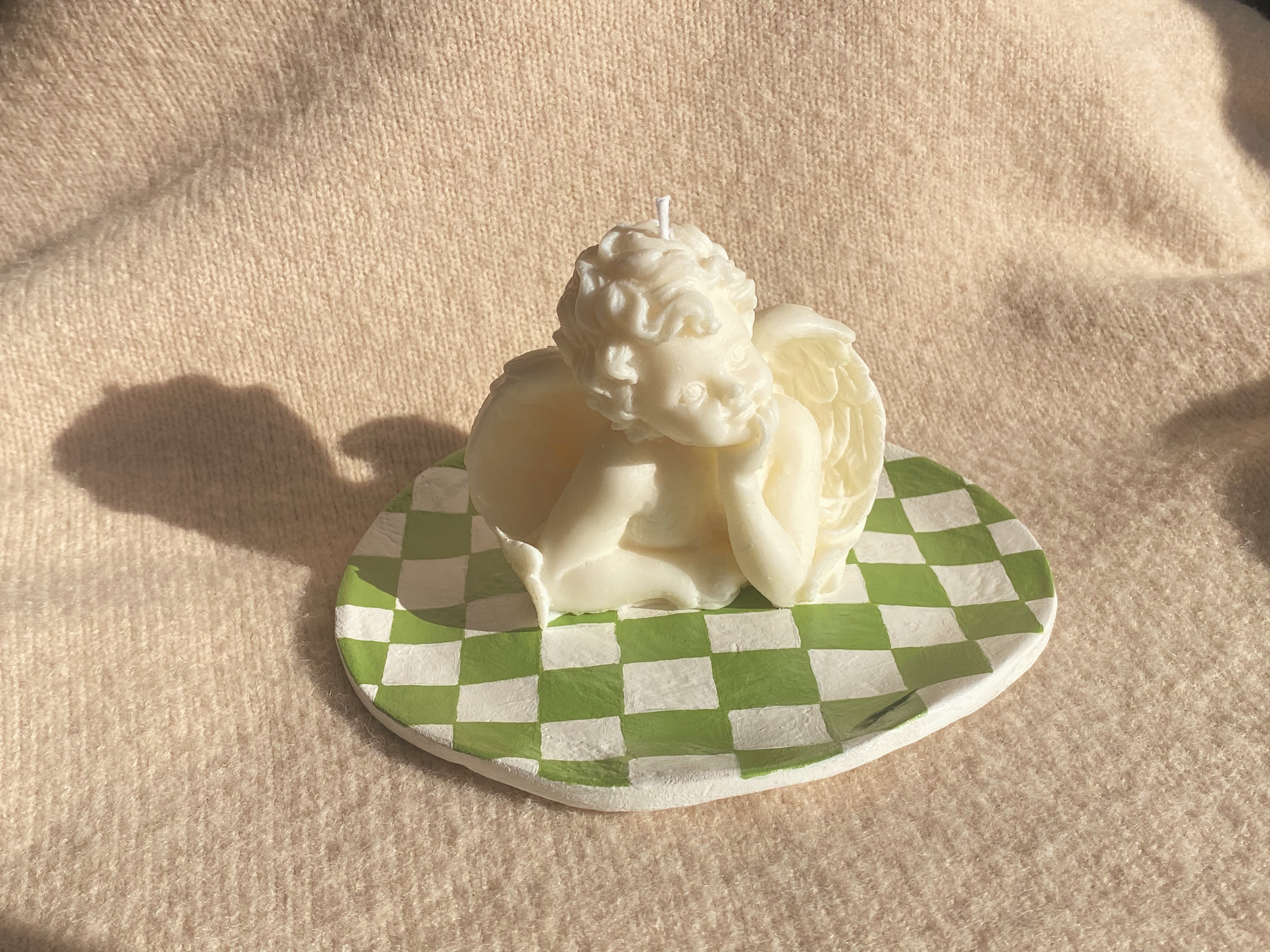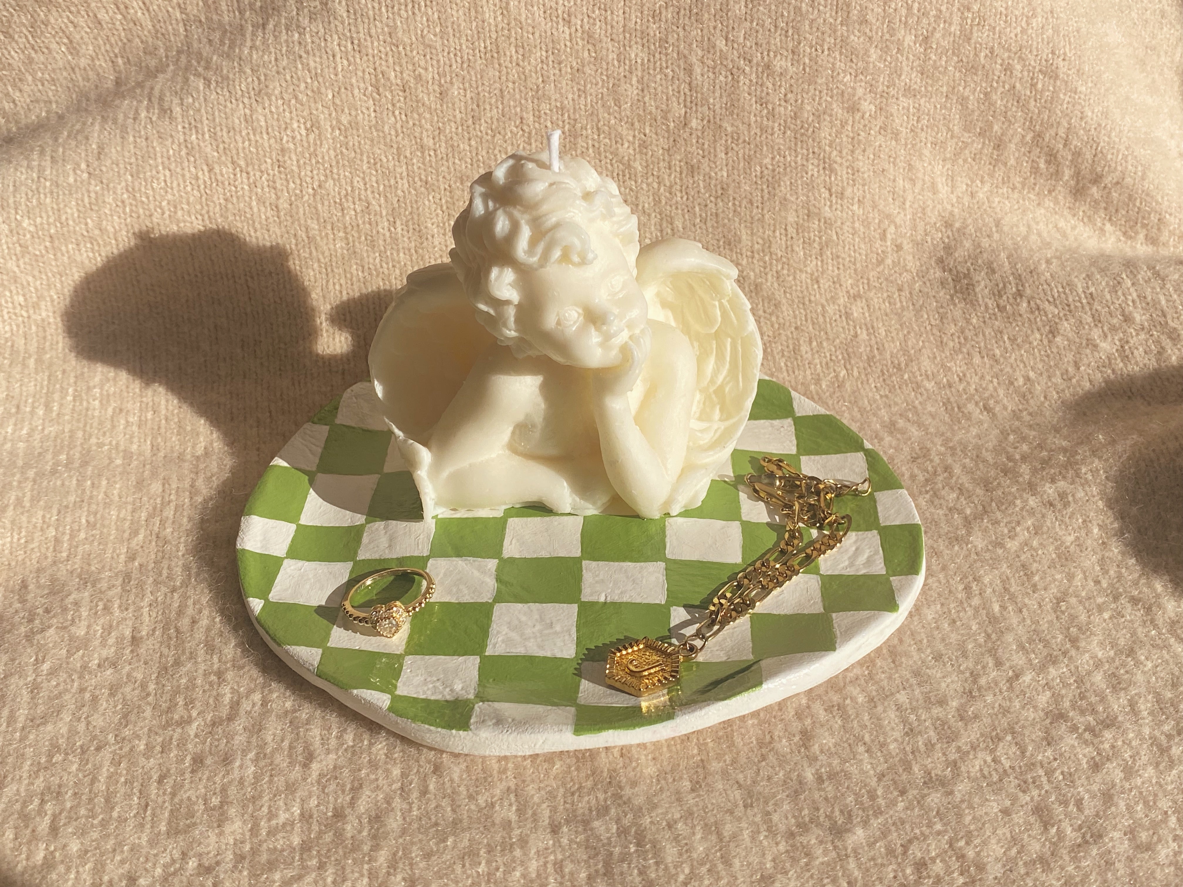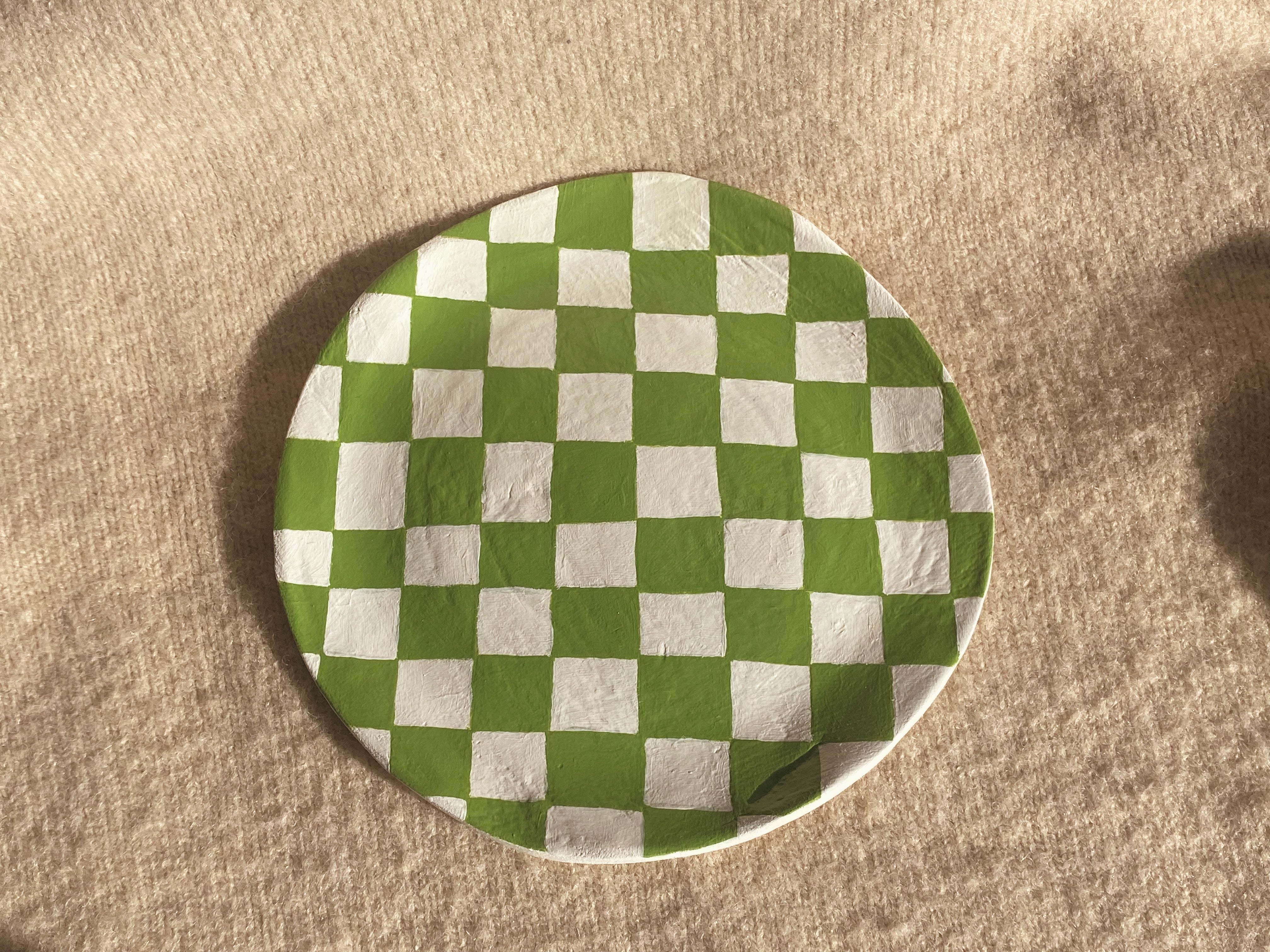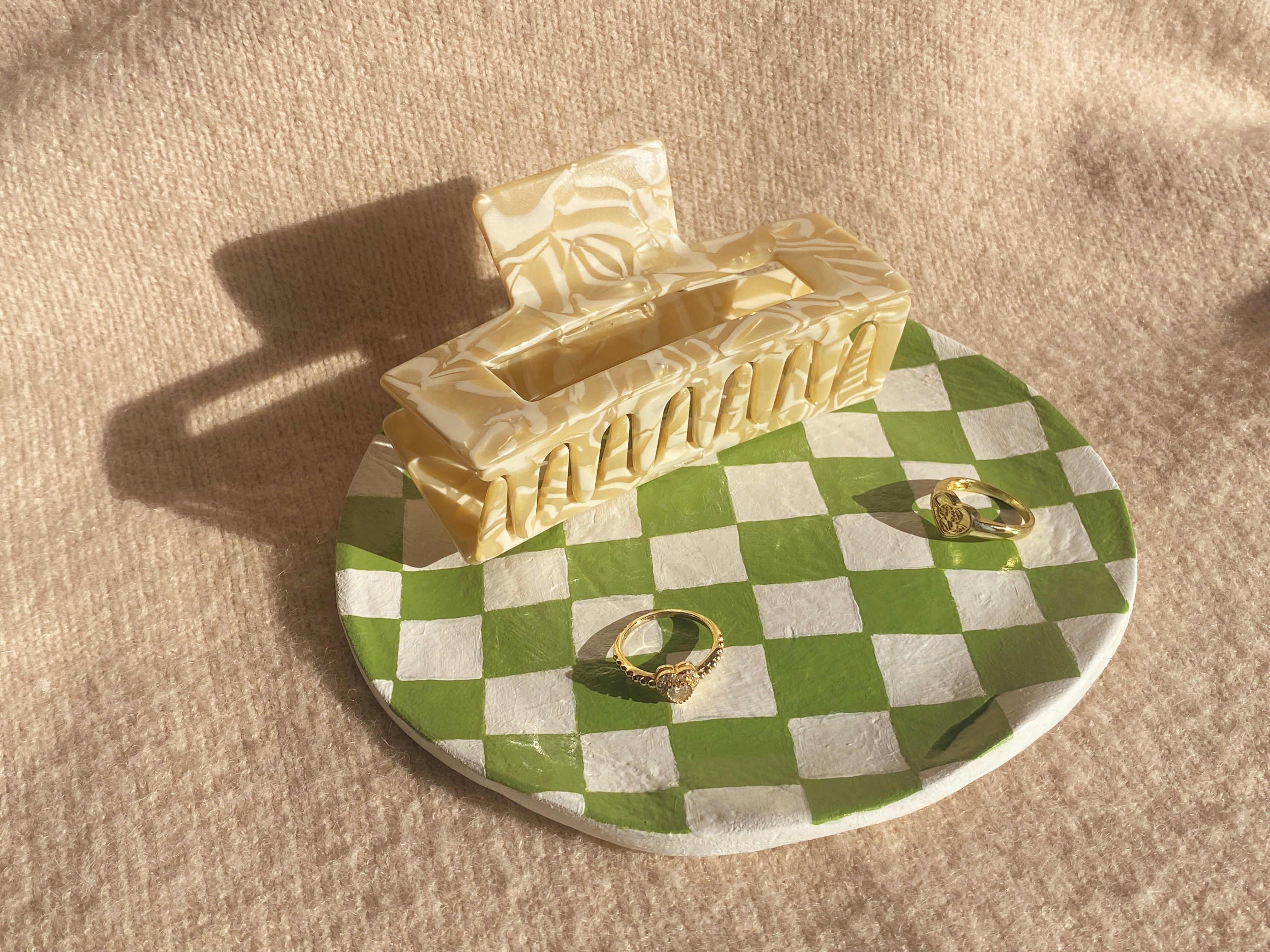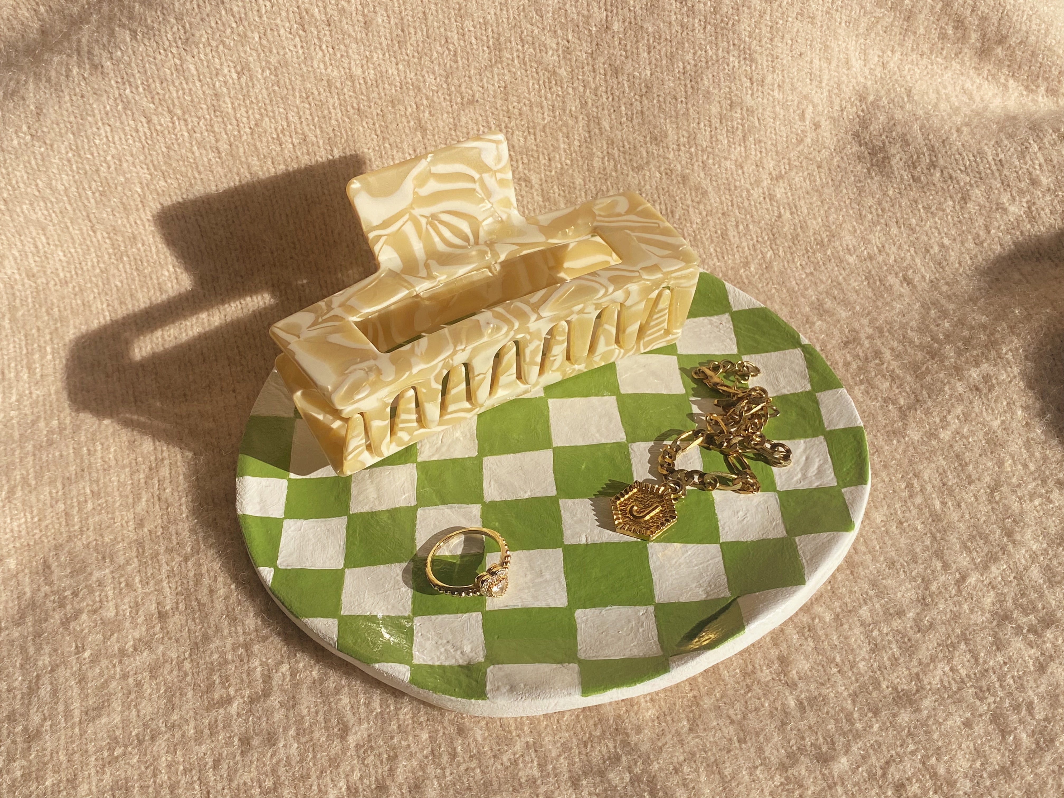 This clay dish is hand painted with a cute green and whited checkered pattern. Use your trinket tray as a decor candle burning dish, or a catch-all for jewelry, hair clips, keys, and other accessories. These dishes are handmade with clay, painted with acrylic paints, and then sealed with a clear coat to create a durable and shiny finish.