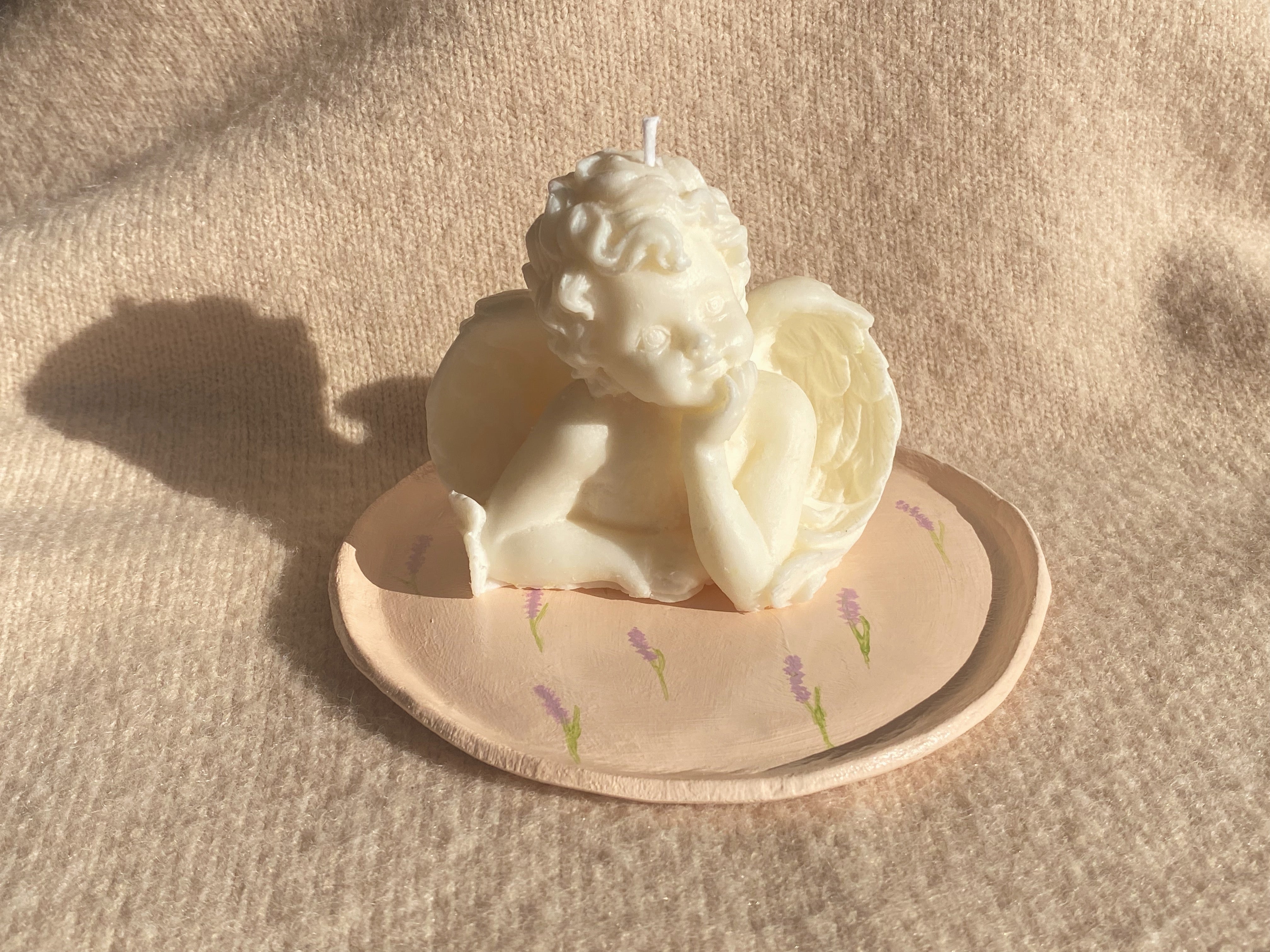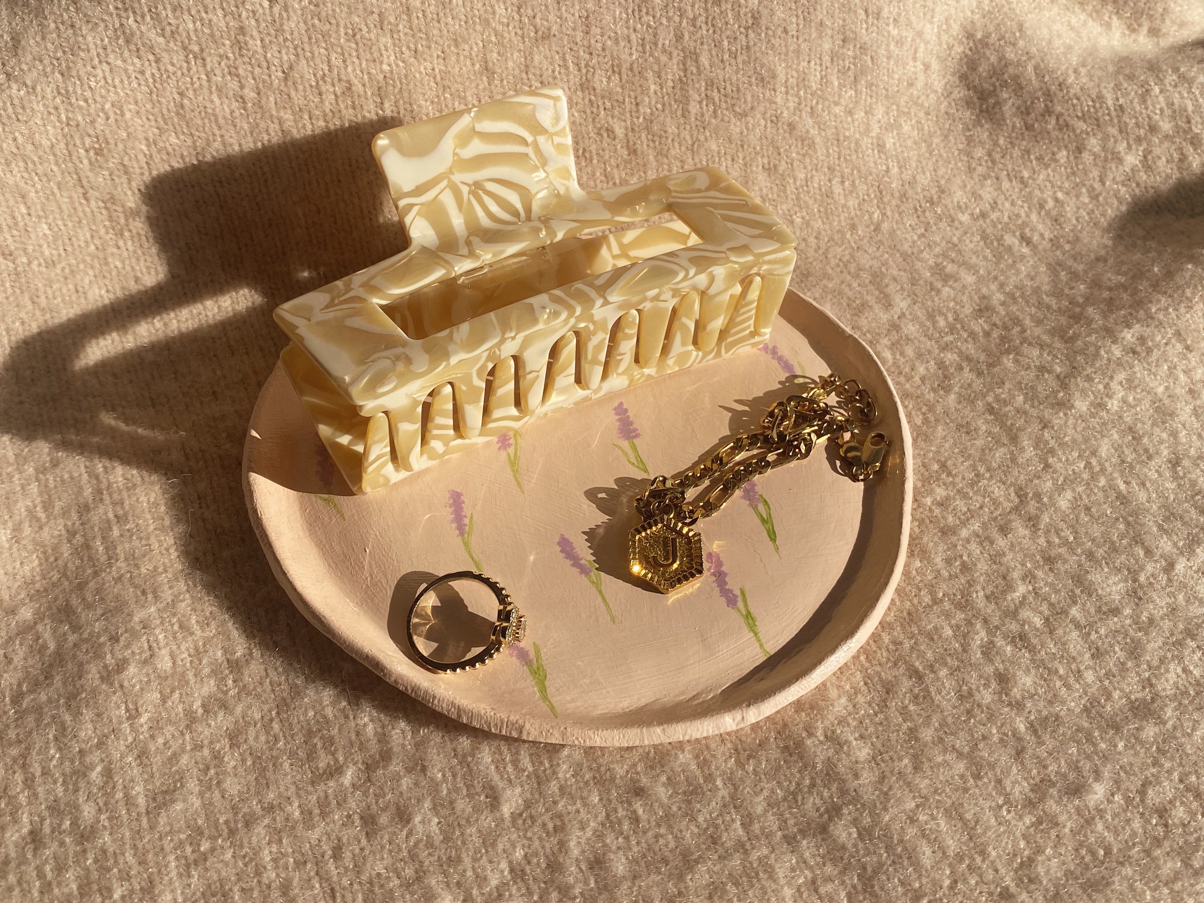 This clay dish is hand painted with cute little lavender flowers on a beige background. Use your trinket tray as a decor candle burning dish, or a catch-all for jewelry, hair clips, keys, and other accessories. These dishes are handmade with clay, painted with acrylic paints, and then sealed with a clear coat to create a durable and shiny finish.